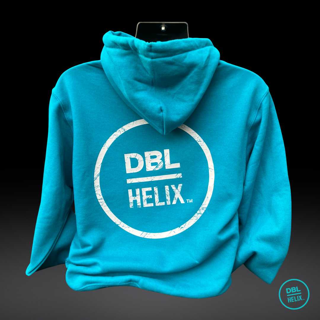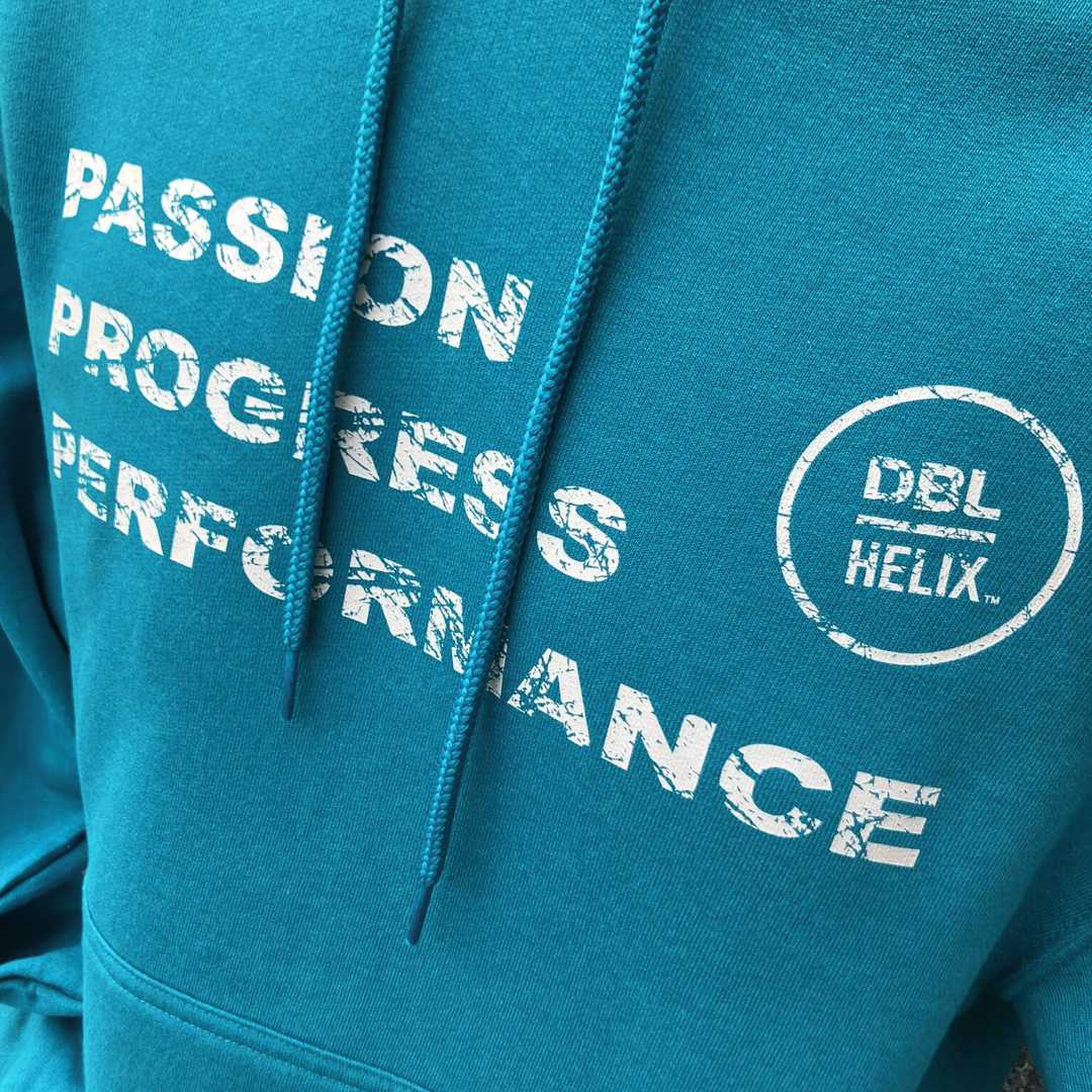 Layer up with this teal hoodie with rib cuffs and waistband, pouch pocket, and "Passion, Progress, Performance" stamp.