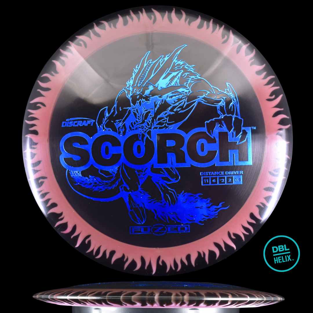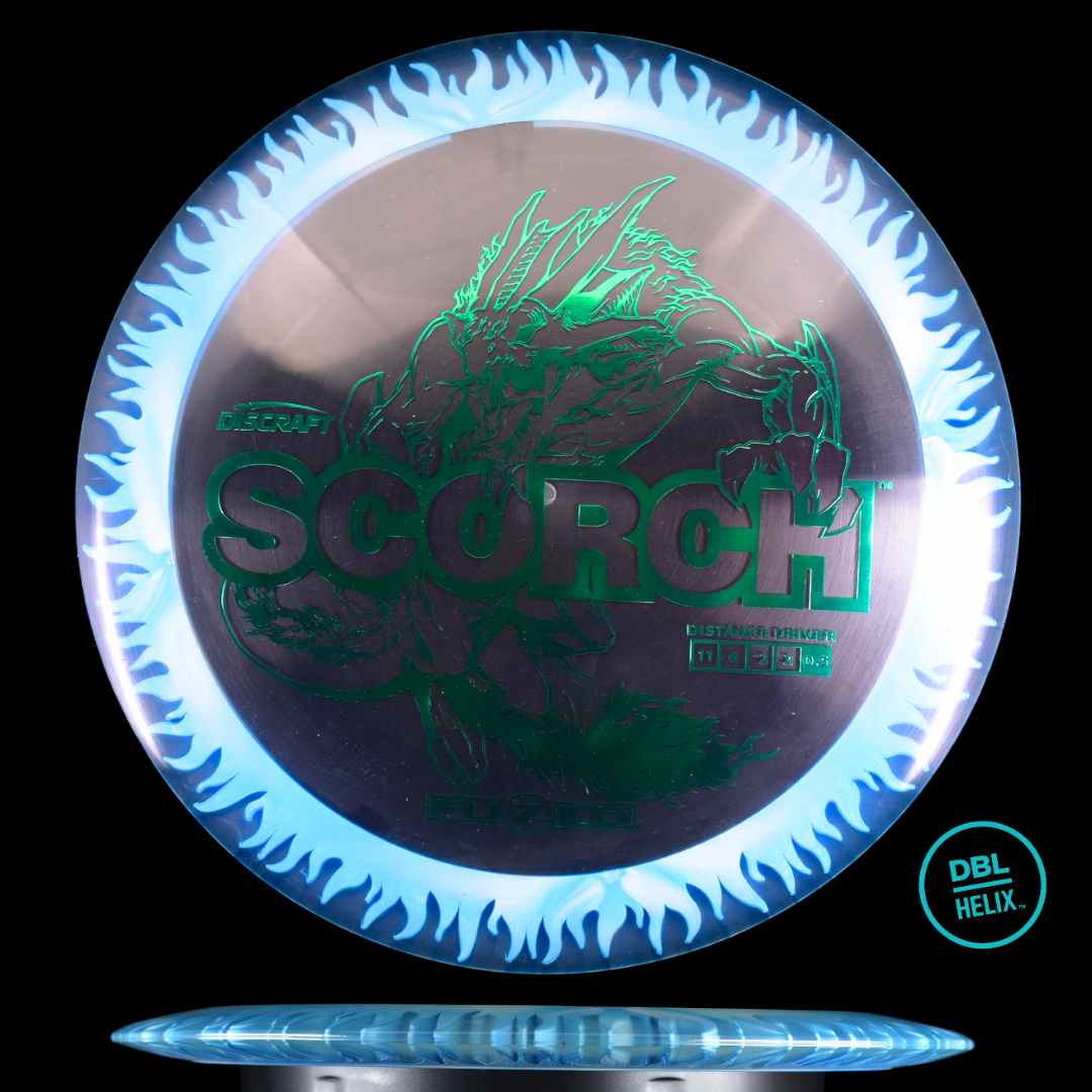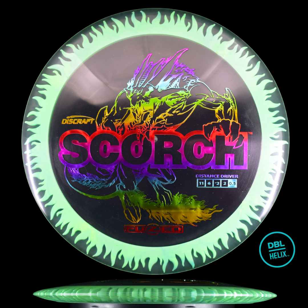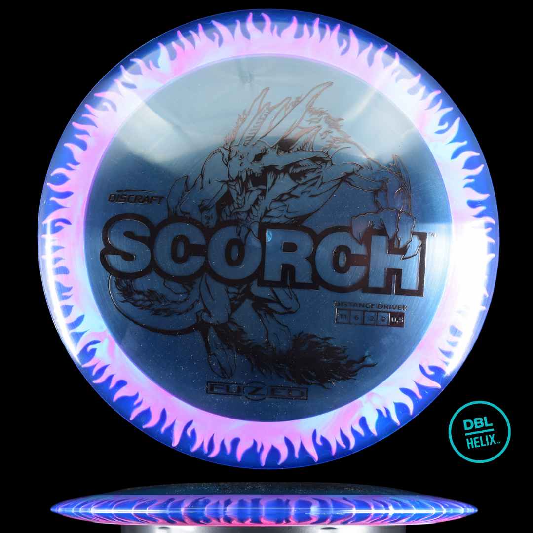 The long-awaited stock FuZed Scorch is here! Featuring our special FuZed Line process, each disc boasts a vibrant flame-burst effect on the rim. This run is notably domey, adding extra glide for those big turnover shots and hyzer flips that define the Scorch’s signature flight.