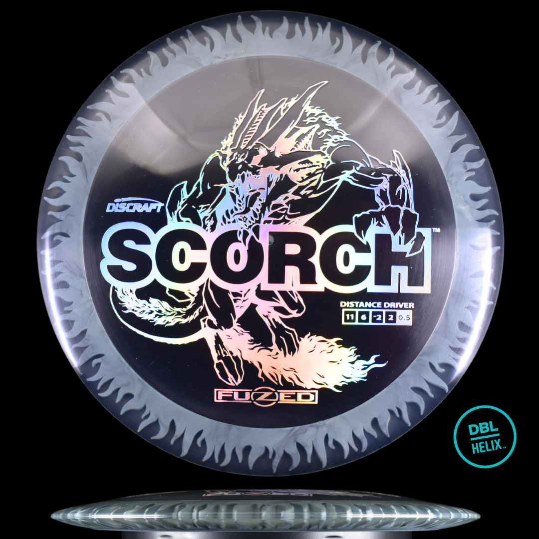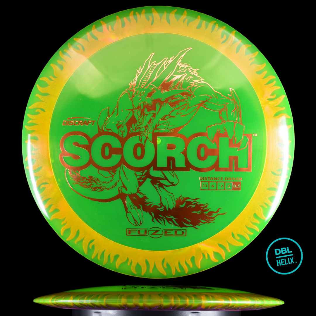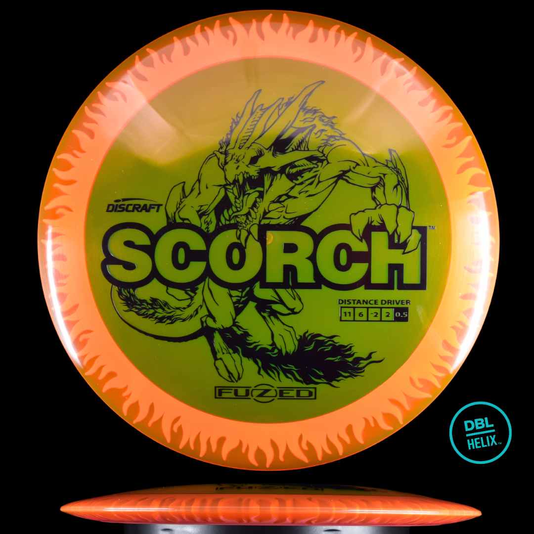 The long-awaited stock FuZed Scorch is here! Featuring our special FuZed Line process, each disc boasts a vibrant flame-burst effect on the rim. This run is notably domey, adding extra glide for those big turnover shots and hyzer flips that define the Scorch’s signature flight.