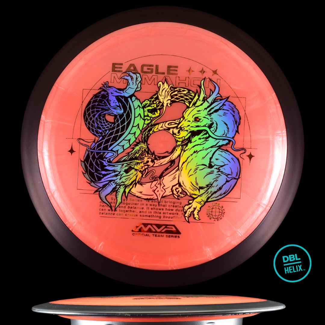 Debuting this month, we’re bringing you the next Eagle McMahon Team Series disc in his new Synergy Series of stamps, illustrated once again by the impeccable Green C Studio, the Plasma Dimension! One of Eagle’s most used drivers, the Dimension is a demanding, 14.5 speed overstable driver with power-resistant stability and his first choice for his new series of stamps centered around the concept of duality in harmony. High power players will be able to manipulate stable lines as needed, while advanced and beginner players will have one of the strongest headwind fighters their bag could have. Find out why Eagle keeps his Dimension close by trying your own today!